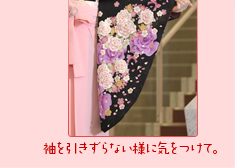 小振り袖は、手すり等に引っかからない様に、前で重ねる様にすると良いでしょう。